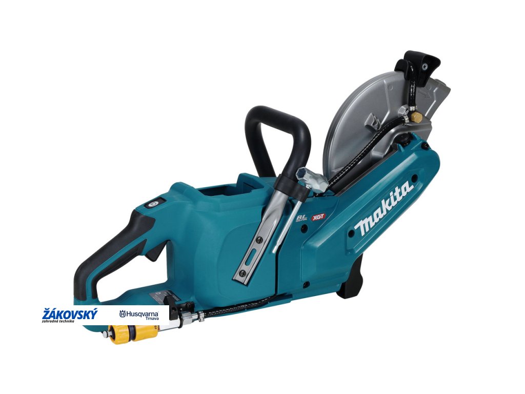 - Výkonná akumulátorová rozbrusovacia píla s priemerom kotúča 230 mm a hĺbkou rezu 88 mm, vybavená prípojkou na vodu.