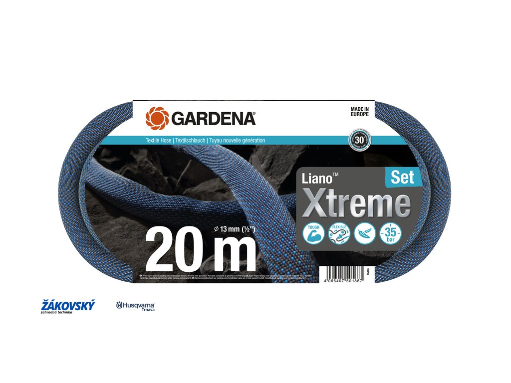 Textilná hadica Liano™ Xtreme vydrží tlak až 35 barov, pri ktorom dôjde k jej prasknutiu a môže zostať na záhrade po celý rok, pretože je odolná voči mrazu a UV žiareniu. Neobsahuje škodlivé látky ani ftaláty (<0,1 %), kadmium, olovo a bárium (<0,1 %).