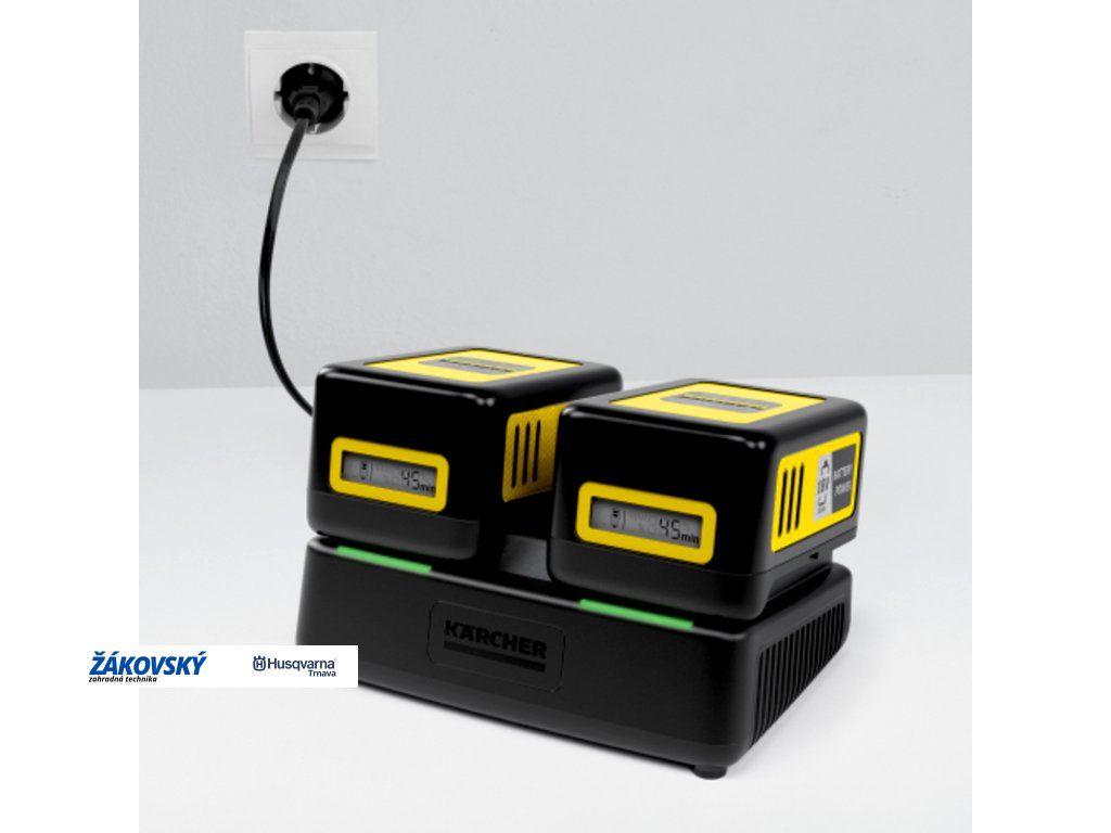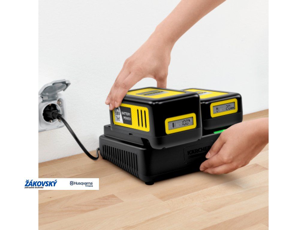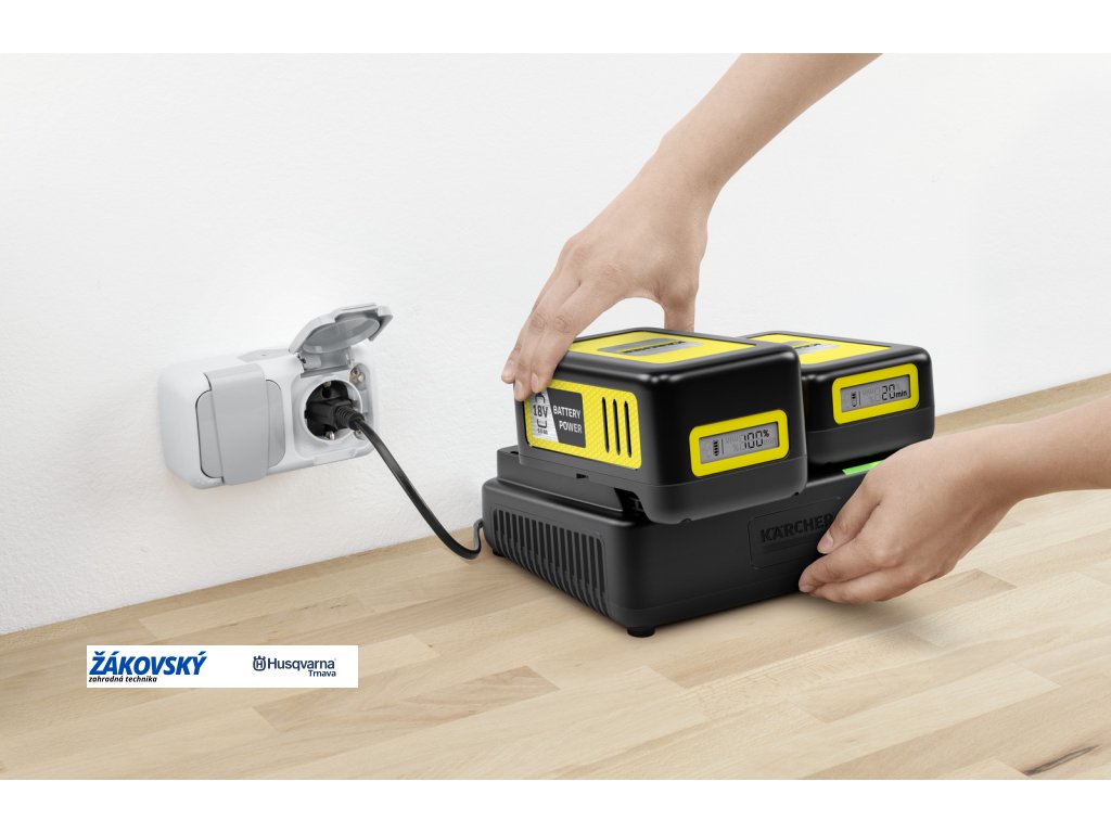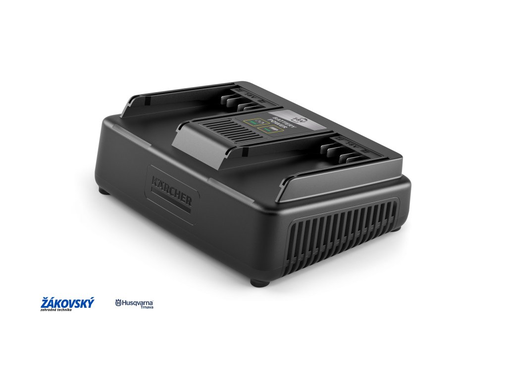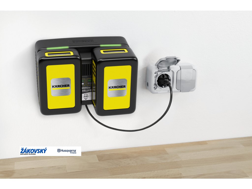 Duálna rýchlonabíjačka dokáže nabíjať 2 batérie súčasne vďaka 2 slotom. Dá sa ľahko pripevniť na stenu pomocou vstavaného nástenného držiaka. Rýchlonabíjačka nabije 18 V/2,5 Ah batérie Kärcher Battery Power na 80 % len za 44 minút. Dá sa použiť aj na dobíjanie všetkých ostatných 18 V vymeniteľných batérií na 18 V batériovej platforme Kärcher.Dodatočné parametre