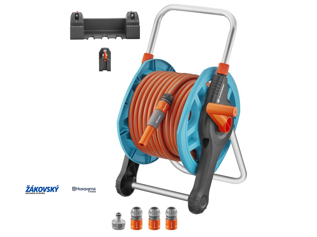 Pomocou GARDENA nástenného bubna na hadicu Basic (25 m) predávaného v sade môžete ľahko zavlažovať vaše rastliny, kvety a záhony. Súprava s nástenným bubnom na hadicu Basic pripravená na okamžité použitie obsahuje 25 m dlhú hadicu Basic s priemerom 1/2" (13 mm), nástenný držiak, nákrutku s adaptérom vhodnú pre vodovodné kohútiky so závitom 26,5 mm (G 3/4") a 33,3 mm (G 1"), tri rýchlospojky Basic, stopspojku Basic a postrekovač Basic. Súpravu 2 v 1 môžete flexibilne použiť pre montáž na podlahu alebo na stenu. Teleskopická rukoväť a špeciálny skladací mechanizmus umožňujú priestorovo úsporné uskladnenie vo vašej domácnosti. Vďaka veľkej kľuke je možné hadicu pohodlne navíjať, otočná os zabraňuje krúteniu spojovacej hadice. Šikmé pripojenie hadice zabraňuje jej zalomeniu a postrekovač s plne nastaviteľným vzorom rozstreku, od jemnej hmly až po plný lúč, je perfektný na zavlažovanie a čistenie. Vďaka stopspojke prestane voda ihneď po odobratí koncového nadstavca prúdiť. Znovu sa spustí až po opätovnom pripojení koncového prístroja. Nákrutka s funkciou Anti-Splash vám umožňuje pracovať bez rozstrekovania na kohútiku a hadicové pripojovacie armatúry so špeciálne tvarovanou upínacou maticou zaisťujú bezpečné uchytenie hadice. Bubon na hadicu Basic (25 m) je kvalitný výrobok vyrobený v Európe a GARDENA naň poskytuje záruku v trvaní piatich rokov. Zavlažovanie, ktoré je vždy pripravené na akciu! Original GARDENA System.