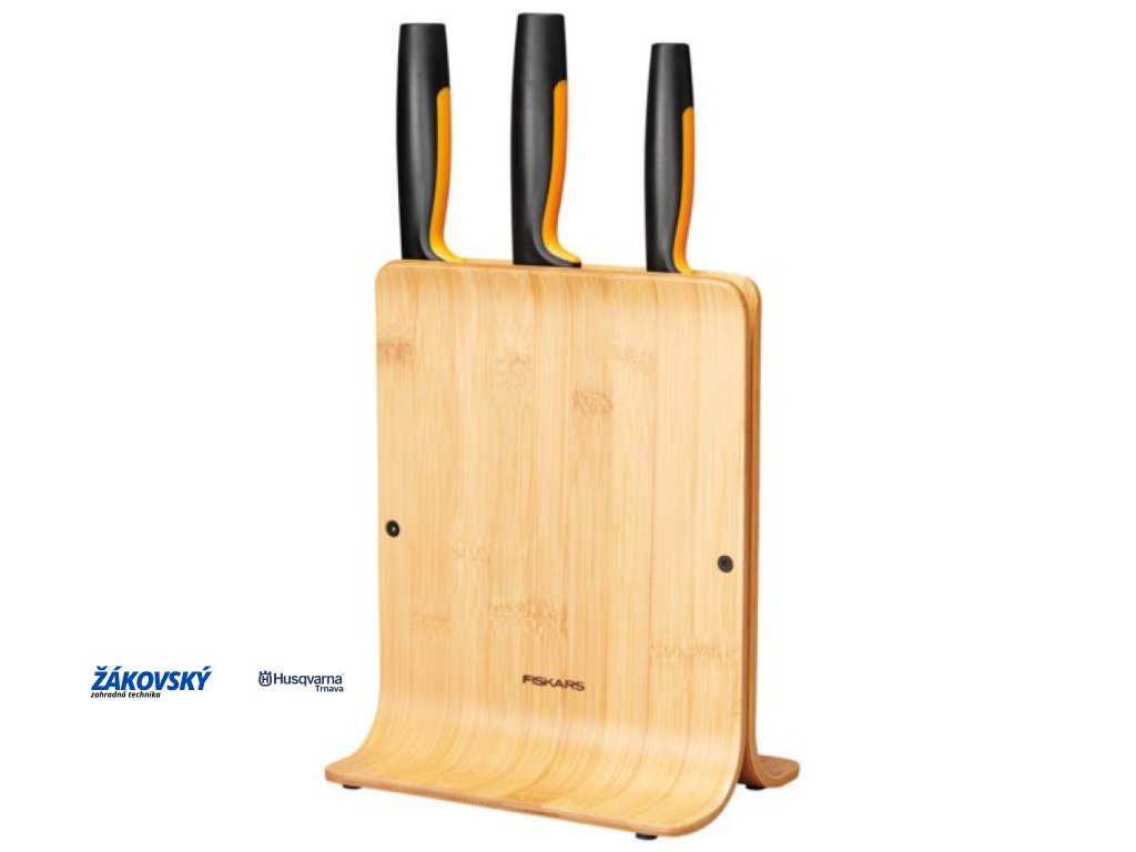Bambusový blok nožov Fiskars Functional Form ™ obsahuje 3 nože: veľký kuchársky nôž, nôž Santoku a okrajovací nôž