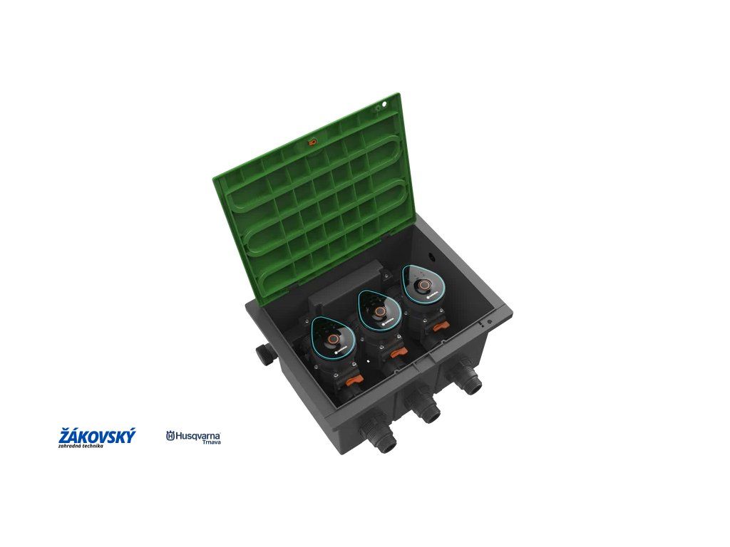 Priložené 3 zavlažovacie ventily 9 V sú ovládacou pákou automatickej prevádzky alebo manuálneho zatvárania a vďaka vnútorným závitom 1" ich možno ľahko nainštalovať do GARDENA boxu na ventily V3, ktorý je súčasťou tejto súpravy.