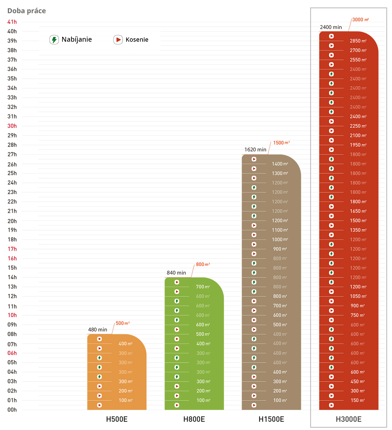 Doba napájania a efektivita práce sa u jednotlivých modelov líši. Podľa nasledujúcej tabuľky si vyberte vhodný model podľa veľkosti trávniku a predpokladanej doby práce. Napríklad robotická kosačka Segway Navimow H3000E dokáže pokosiť trávnik o rozlohe 3000 m2 za približne 40 hodín.