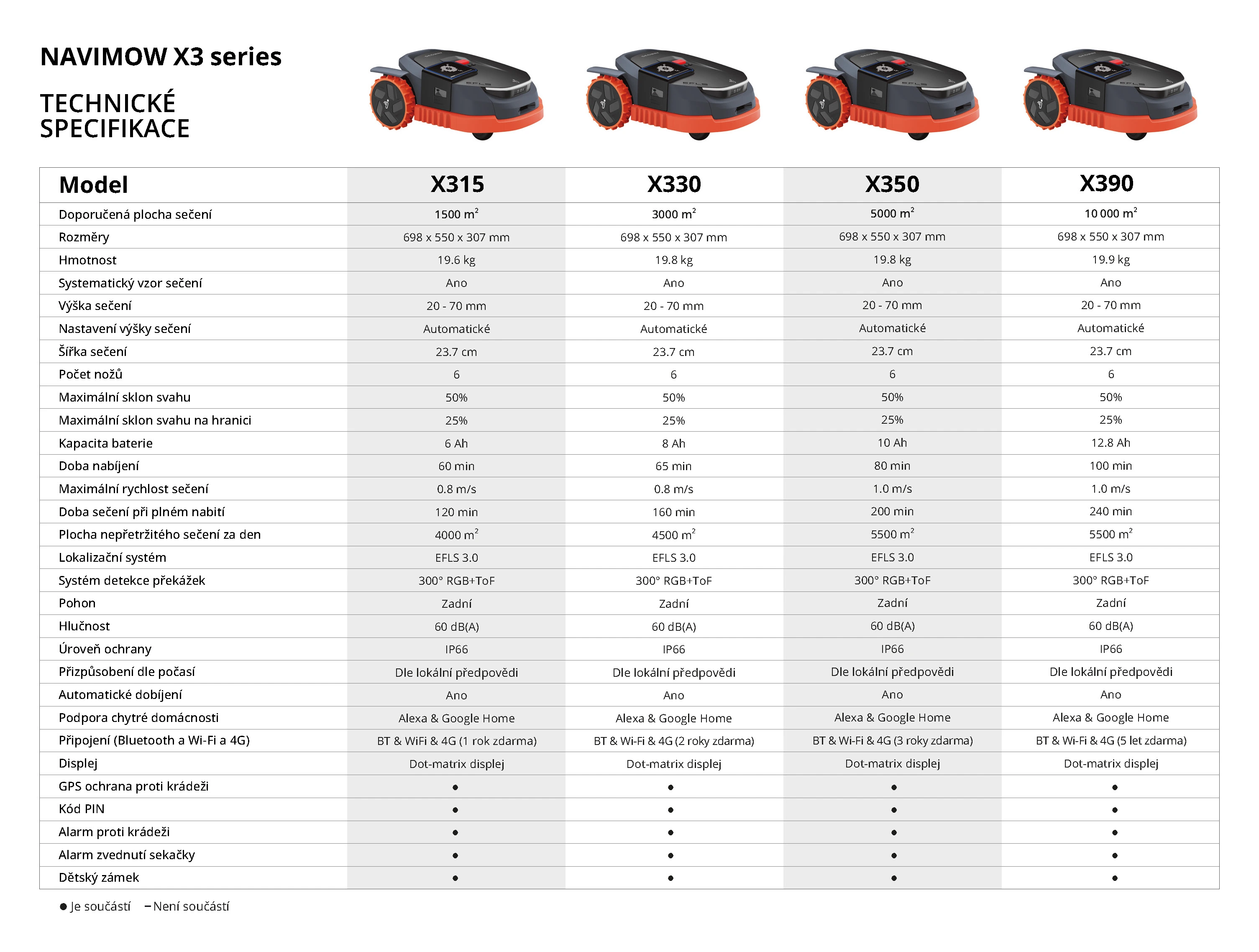 - Vyhýbanie sa prekážkam vďaka systému 3 kamier a ďalších snímačov integrovaných v kosačke.