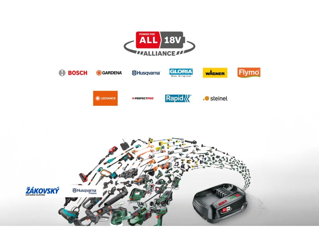 18V akumulátorový systém aliancie POWER FOR ALL je optimálny na domáce práce a práce v záhrade. Jeden akumulátor je možné používať v niekoľkých záhradných nástrojoch rôznych značiek, čo zaisťuje vysokú flexibilitu a menšie nároky na uskladnenie. 18V akumulátory Husqvarna sú dostupné v dvoch veľkostiach a boli optimalizované pre náradie Aspire™, aby zaistili lepší výkon a dostatočnú dobu prevádzky pre rôzne kutilské projekty na záhrade. Okrem toho kompaktná veľkosť akumulátora a nízka hmotnosť uľahčujú použiteľnosť, takže každý typ práce sa vykonáva pohodlnejšie a efektívnejšie. Kosačka Automower® Aspire™ R4 nie je súčasťou radu POWER FOR ALL ALLIANCE a je napájaná vstavaným akumulátorom.